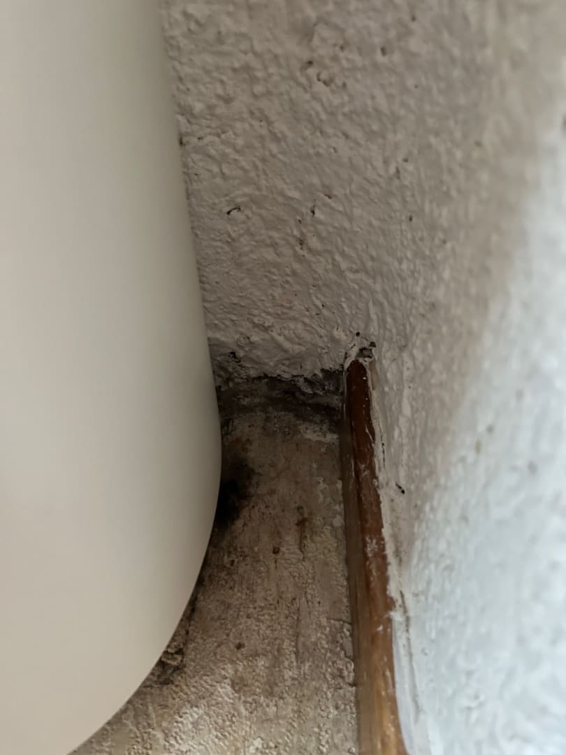 Hier die Wand hinter der Klimaanlage in unserem Zimmer. Ist es Schimmel? Ist es Dreck? Das Zimmer war alt. Es war unglaublich alt. Und so auch der Belag hinter der Klimaanlage