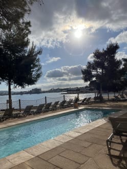 Der kleine Pool mit Meerblick „hinter“ dem Hotel.