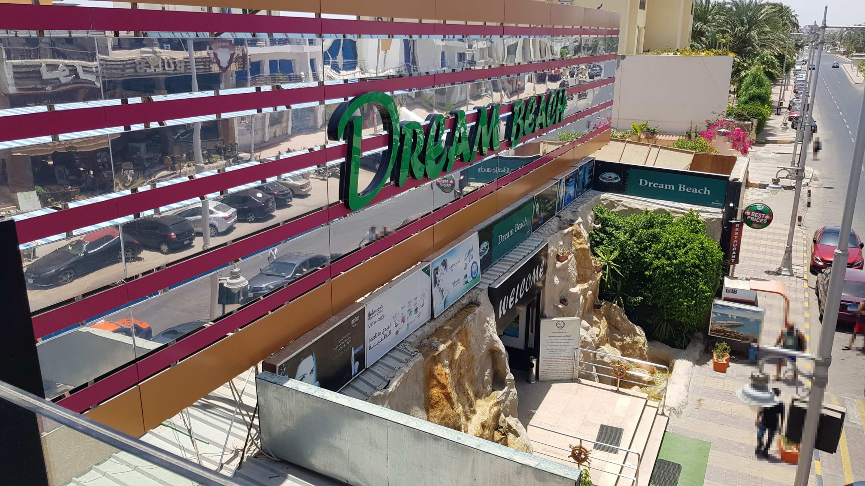 straßenseitiger Eingang zum Strand von der Fußgängerbrücke aus gesehen