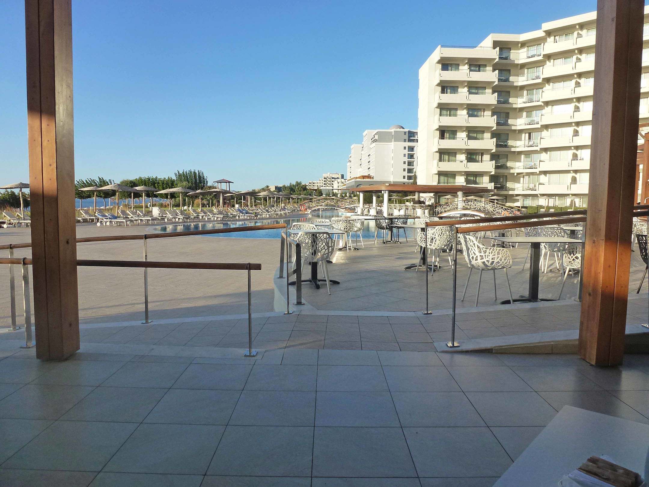 Blick beim Frühstück auf den Pool