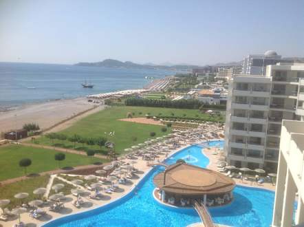 Ausblick vom Balkon auf den Pool und das Meer