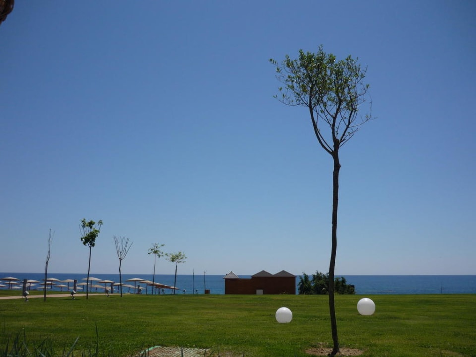 Ausblick von der Liege am Pool auf Garten, Strand und Meer