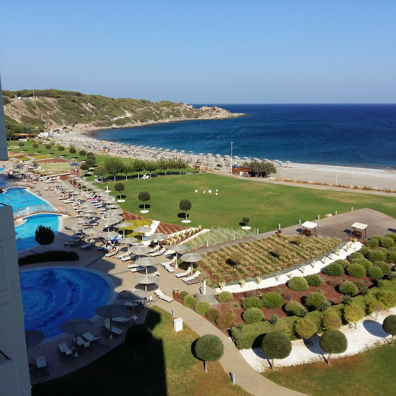 Vom Balkon aus die Aussicht auf Pool und Strand.