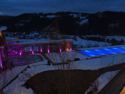 Pools bei NachtLinks der Außenpool mit Verbindung zum Innenpool (ca. 28 Grad), rechts der 25m-Pool zum Schwimmen, der im Winter abgedeckt, aber trotzdem beleuchtet ist.