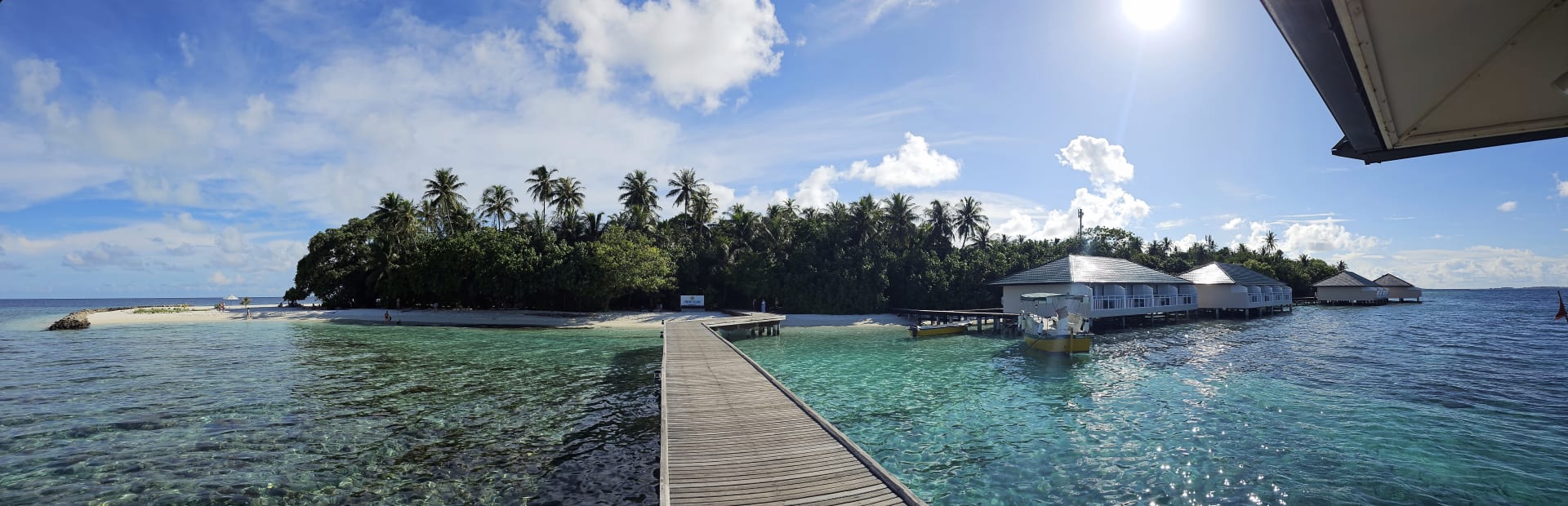 AußenansichtPanorama: Inselseite am Anleger mit den Wasserbungalows und der kleinen Lagune. Bungalows 60 bis 74