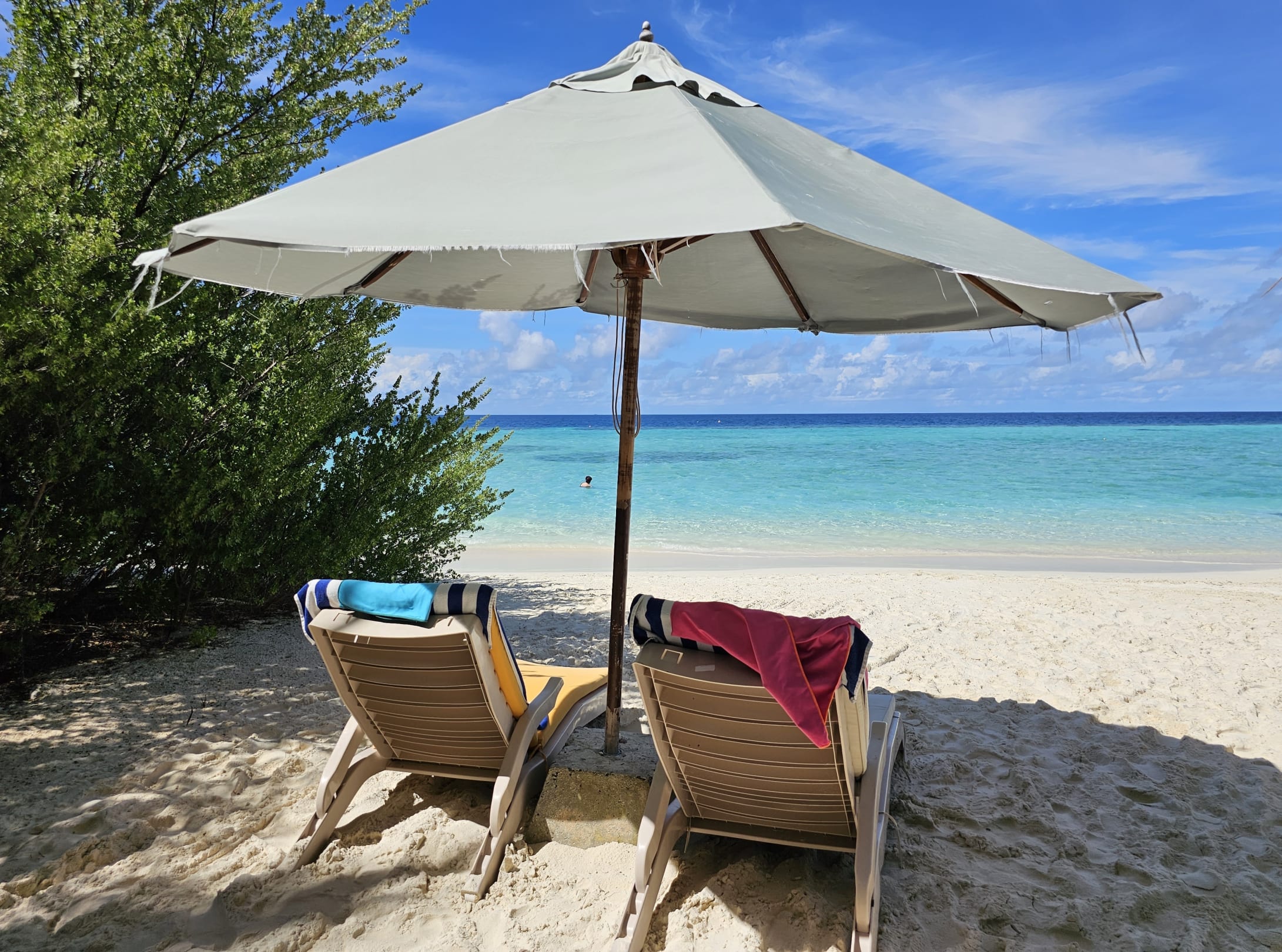 StrandUnser Platz an den letzten Tagen. Bei bewölktem Wetter sehr angenehm, aber bei Sonne sehr heiß unter dem Schirm