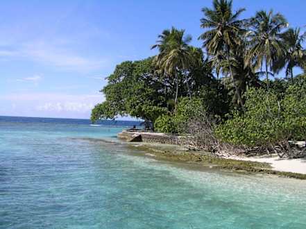 Embudu im Süd-Male-Atoll, die Insel vom Bootssteg aus fotografiert