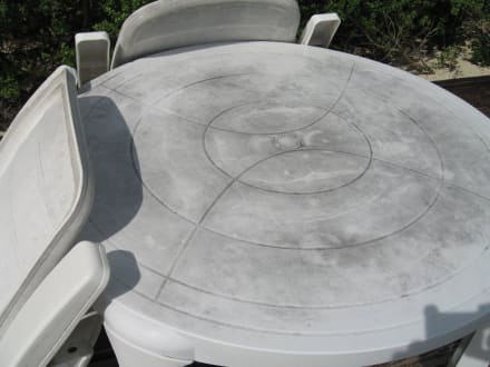 Terrasseninventar der Bar am StrandVöllig vergraute Tische und Stühle die nicht zum Verweilen einladen.