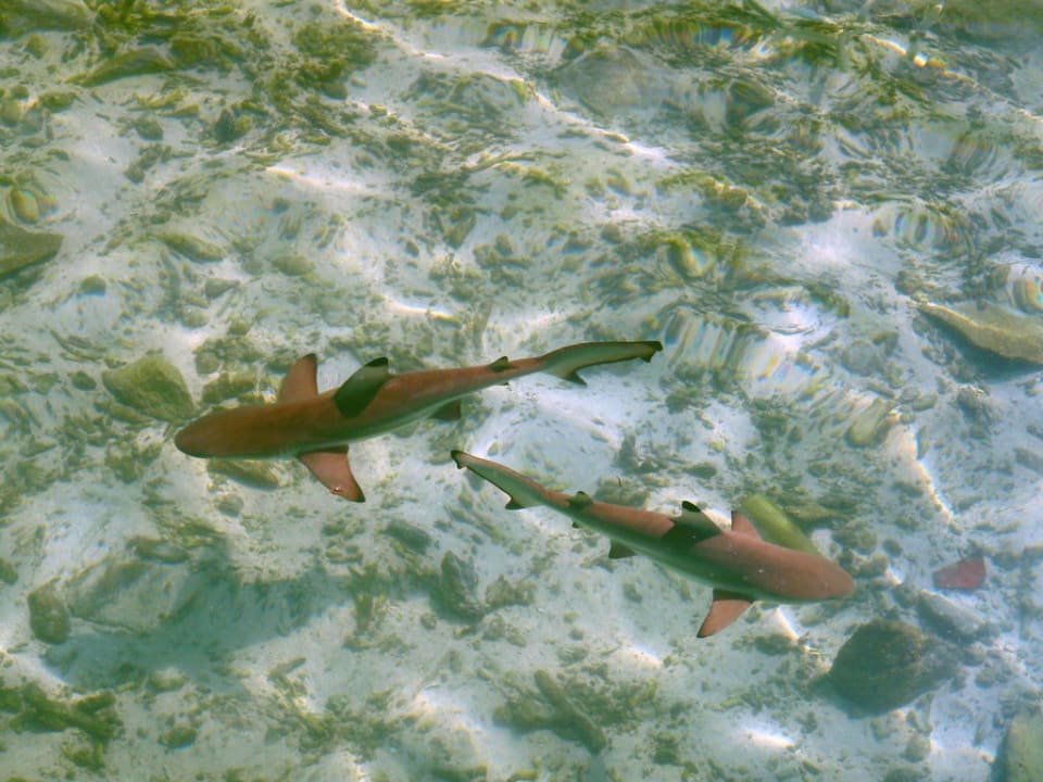 Die Haie kann man immer in der Lagune vor den Wasserbungis beobachten, aber auch im Flachwasser rund um die Insel. Aber keine Angst...die tun nichts.