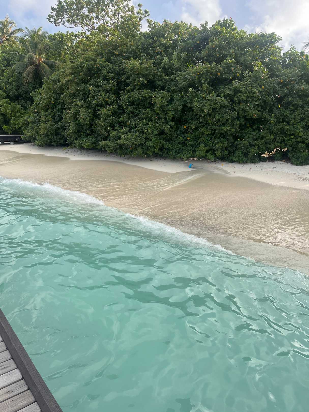Auf dem Steg vor dem Wasserbungis ( für uns wäre dies keine Option gewesen ) dort sieht man das Abwasser der Wäsche ins Meer fließen . Das Wasser ist dort trüb und es schnuppert nach Waschpulver .