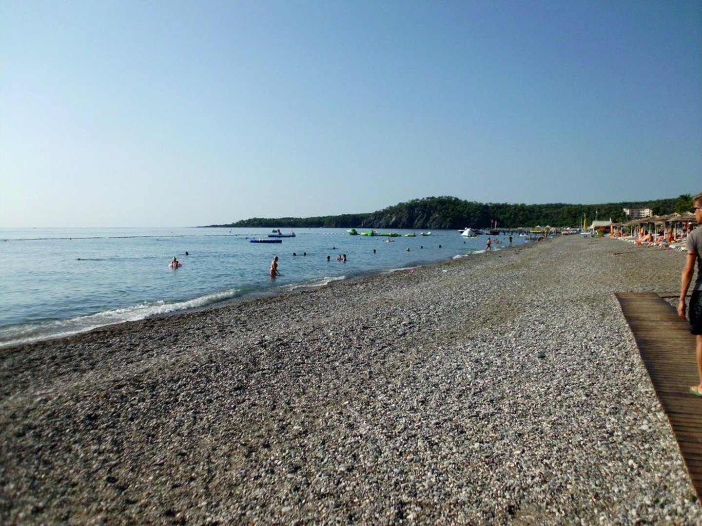 Hier kann man ganz gut erkennen dass es sich um einen Steinstrand handelt. Durch die verlegten Holzplatten oder Badeschuhe allerdings kein Problem darauf zu laufen.