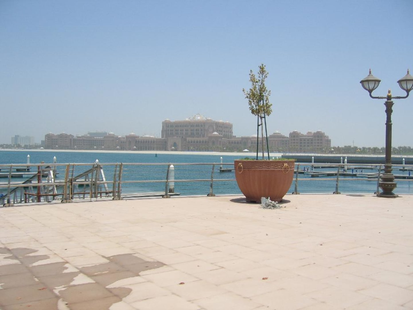 Die Rückseite des Emirates Palace liegt direkt am privaten weissen Sandstrand. Der Strand ist 1,5 km lang, geht an der einen Seite zur Corniche an der anderen Seite zum Jachthafen, Jachten kommen erst im September.