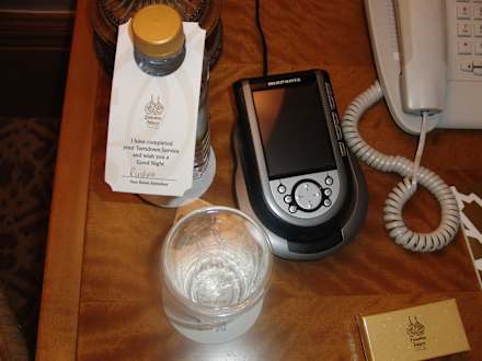 Am Zimmer hat man eine Multifunktions-Fernbedienung. Butler Service, Licht an aus dimmen, TV, Radio lässt sich alles damit steuern. Zwei mal am Tag bekommt man frisches Wasser auf's Zimmer.