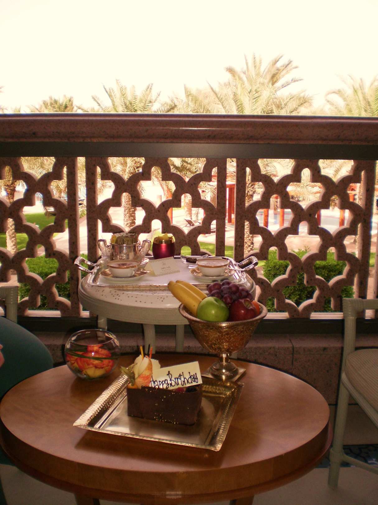 Geburtstagstorte mit Capuccino auf Terrasse