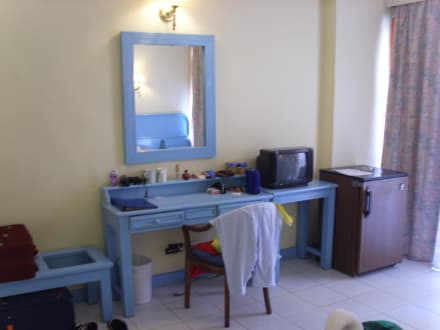 Kommode mit Fernseherein Fersehr wo oft deutsche Sender gar nicht zu sehen waren, daneben der Kühlschrank, der immer leer war. Warum steht er denn da?