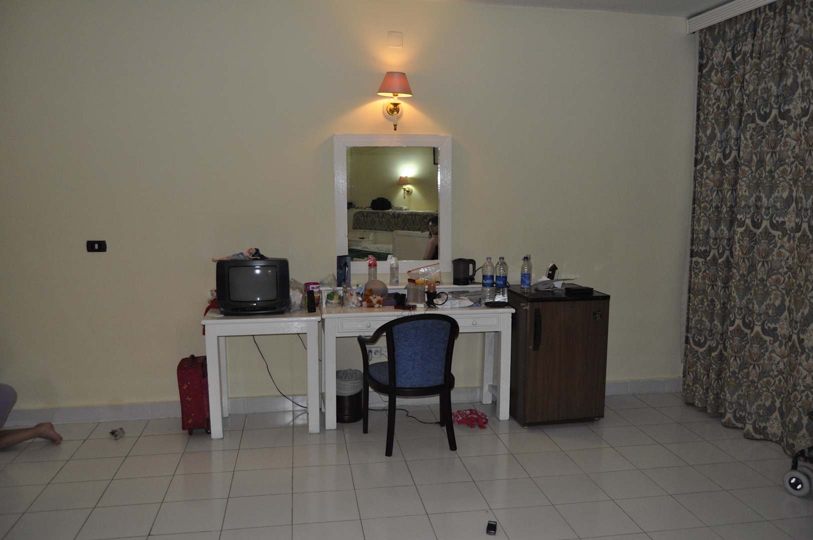 Frisiertisch mit Fernseher und Mini-BarMini-Bar ist leer, wird gegen Bezahlung aufgefüllt. Fernseher klein aber funktioniert, 3 deutsche Sender