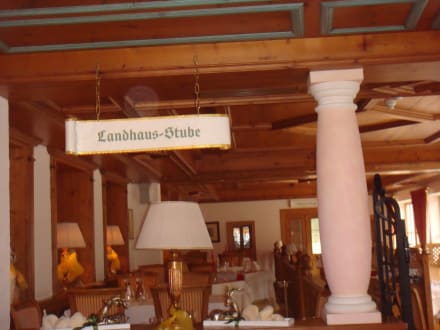 LandhausstubeRestaurant fürs Abendessen, kleinere Tische auf Podest, hinten EIngang zur Johannesstube