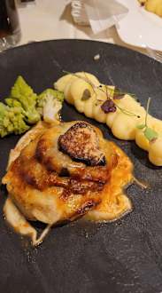 GastroHauptgericht 4 Scheiben Aubergine, 1 Scheibe Tomate, Käse, 3 Stückchen Romaneso und ein Klecks Kartoffelpüree