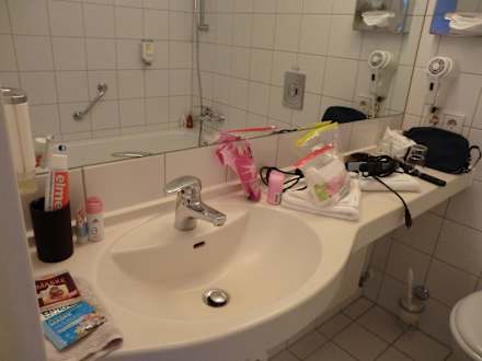 Das Waschbecken und sehr großer Spiegel und Fön