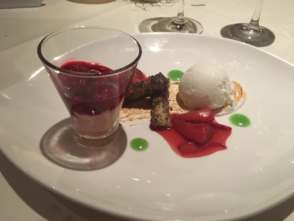 Mohnnudeln auf Rhabarber-Erdbeerkompott, Himbeercreme, Vanille Baiser, Kokoseis