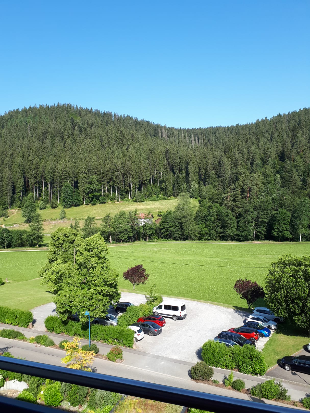 Blick vom Balkon auf einen Teil der Parkplätze gegenüber dem Hotel