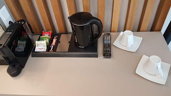 Kaffeemaschine & Wasserkocher mit täglich neu aufgefüllten Kaffepads und Tees.