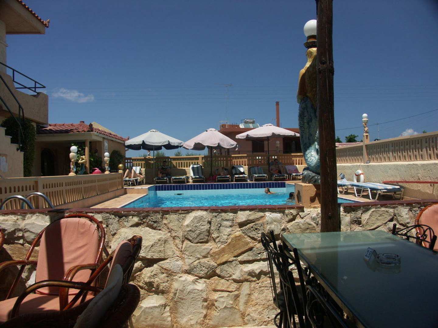 Blick auf den Pool von der gemütlichen Restaurantterasse aus gesehen.