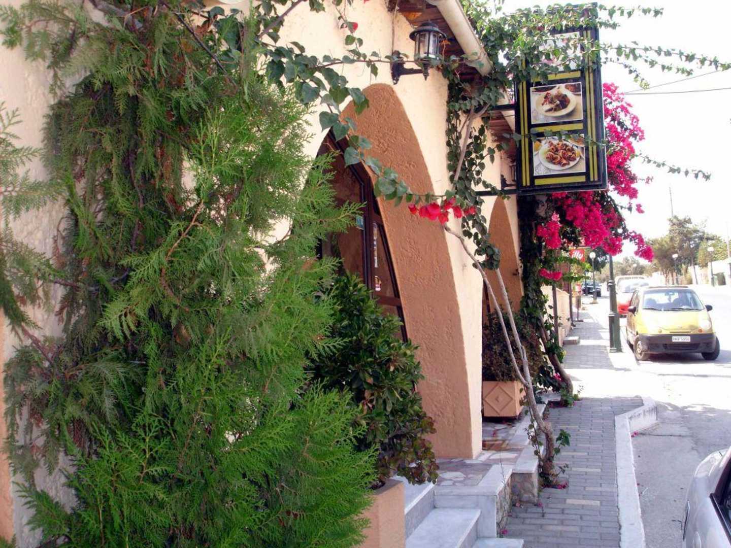 vor dem Hotel, links die Taverne (Rundbogenfenster)