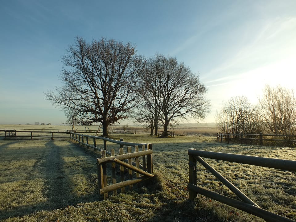 aus dem Garten geht der Blick weit über Felder und Wiesen bis zur Ostsee