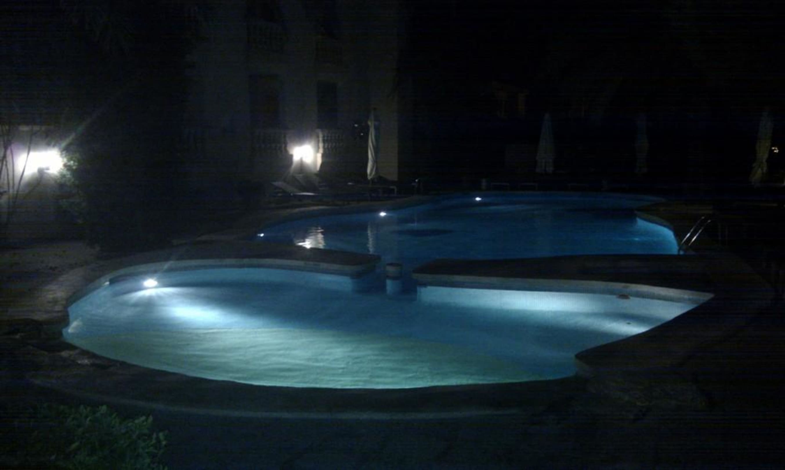 Klein, aber gepflegtIm vorderen Bereich ist das Kinderbecken, im hinteren Bereich der tiefe Bereich (2,20m).