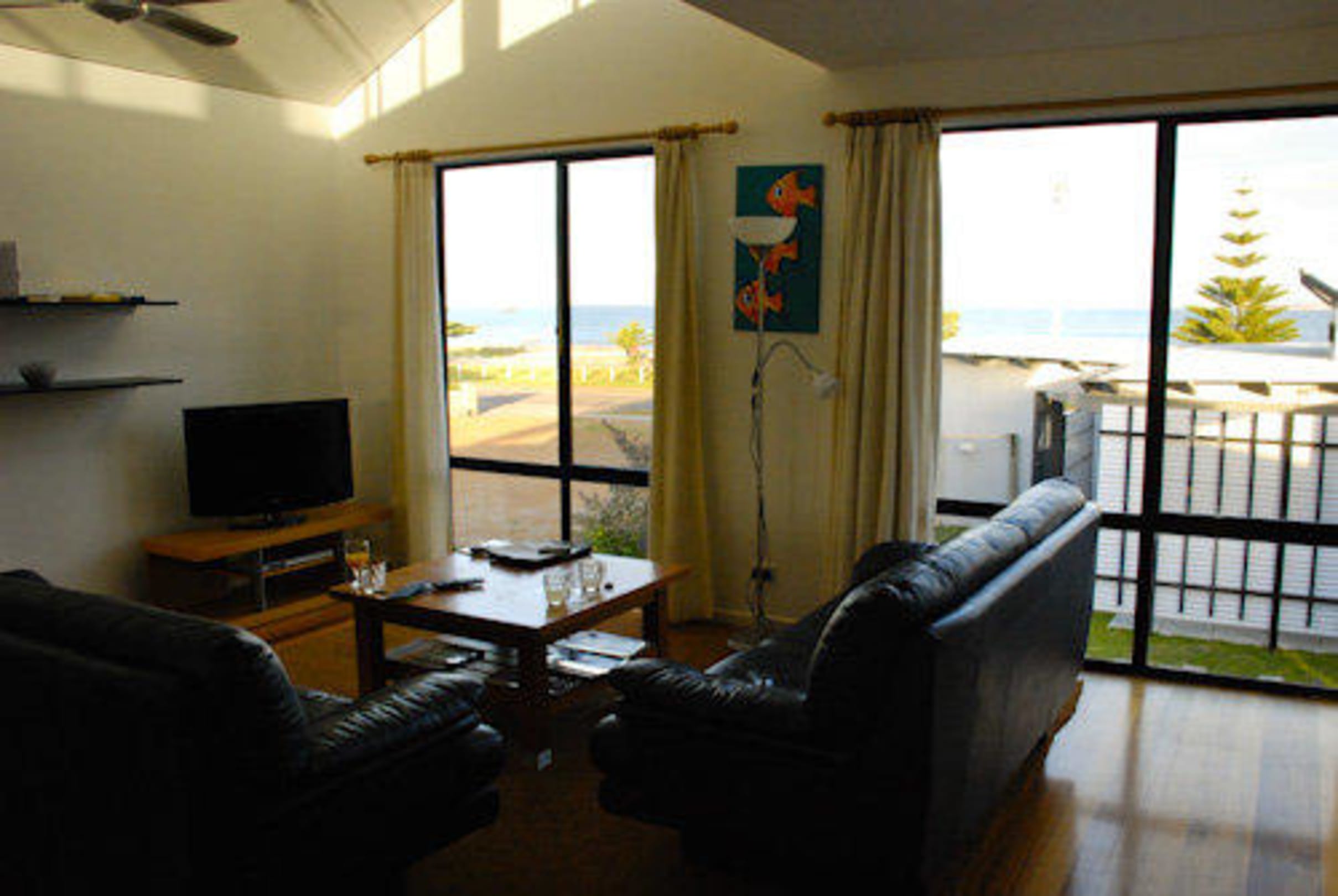 Oberer Stock: Wohnbereich mit Ledercouchen und LCD-TV, Blick aufs Meer