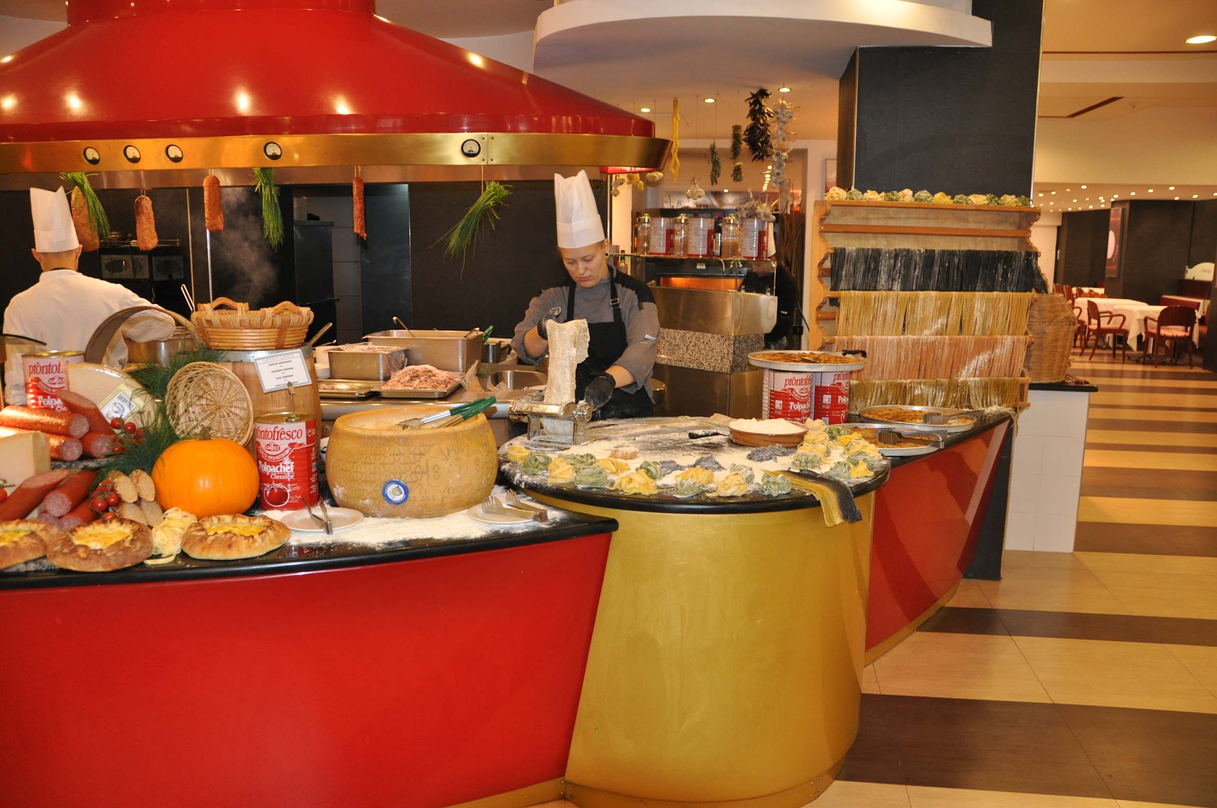 GastroSelbstgemachte Pasta beim italienischen Abend, Pasta, die anschließend noch ein einem großen Parmesankäse flambiert wurde. Lecker!!