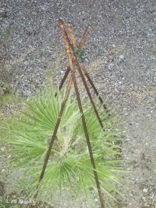 Eine Palme wird mit blanken Eisenstäben geschützt, nicht auszudenken wenn man stolperte geschweige ein Kleinkind, absolut Frechheit und das mitten am Strand