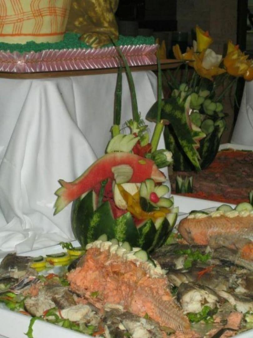 Buffet DekorationBei den Kalten Vorrspeisen schöne Deko geschnitzt aus Melonen und anderem Gemüsse, beim Fisch.
