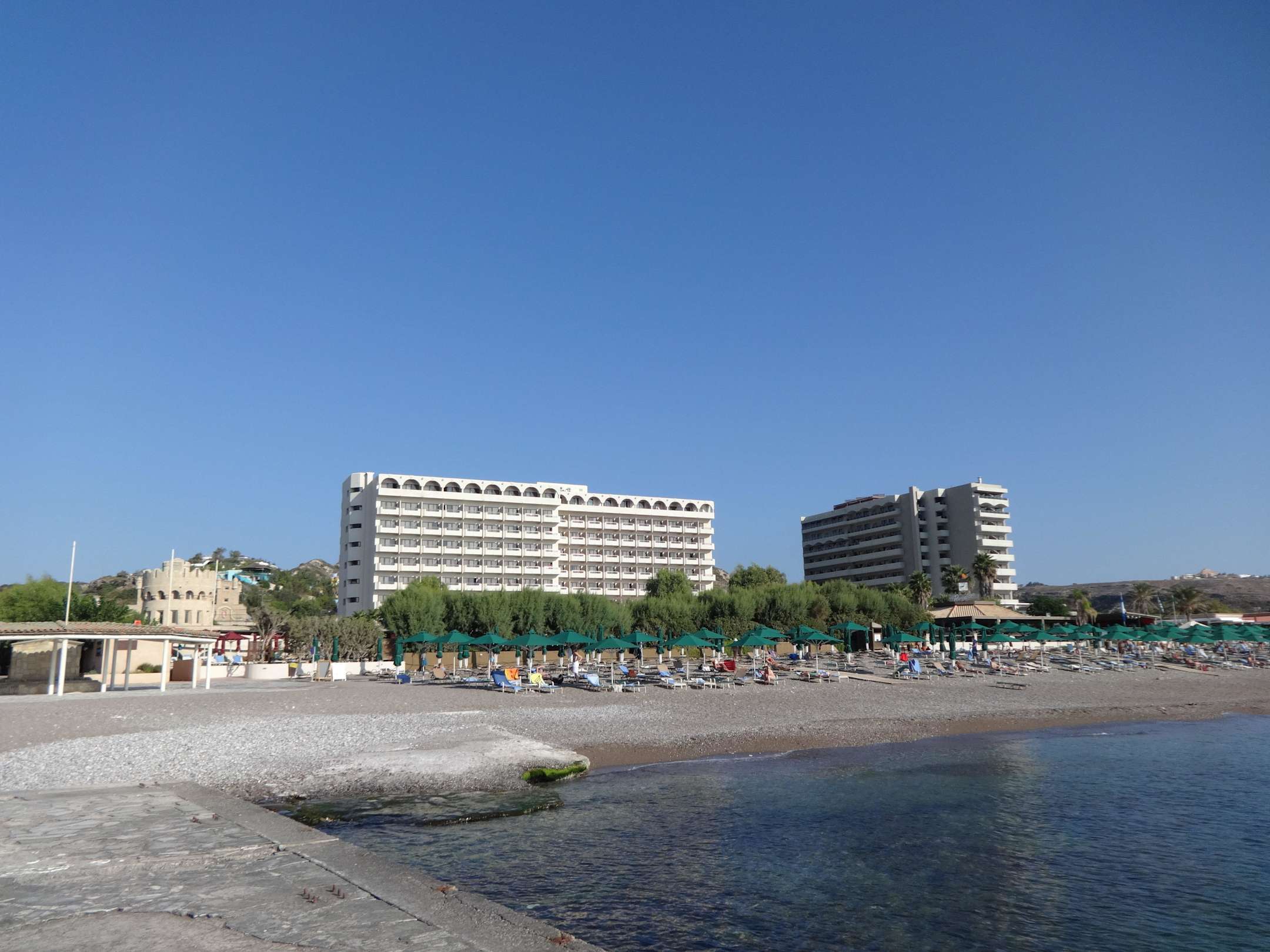 Links Haupthaus "Esperos Palace" (Hauthaus) und rechts "Esperos Mare" für AI-Gäste vom Strand gesehen - im Vordergrund das klare und saubere Wasser