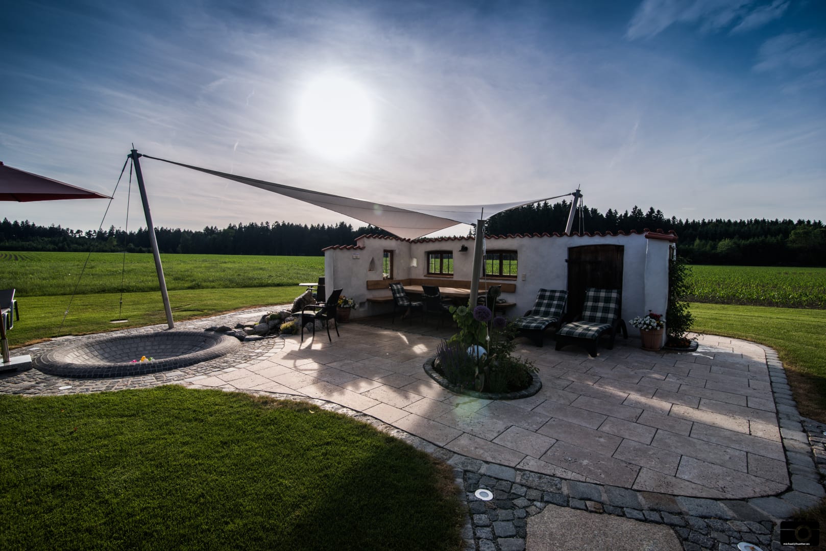 GartenanlageErholungslounge mit Warmwasser Planschbecken und Steckdosen für Ladekabel, Notebooks usw.
