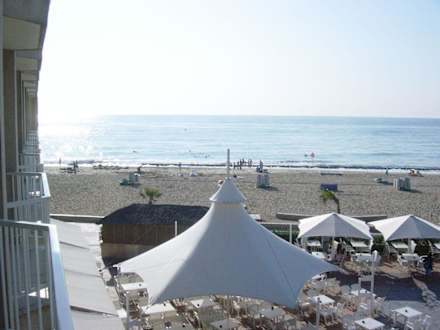 Blick vom Balkon (seitlicher Meerblick) zum Meer. Im Vordergrund der Innenhof mit der Aussenbestuhlung und hinter dem Sonnenschirm - die Aussenbar.