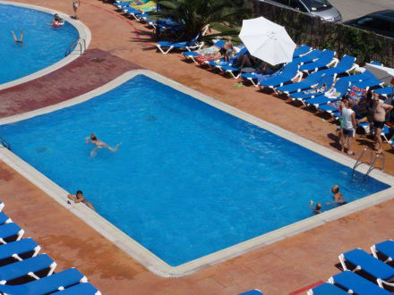 Vom Zimmer aus kann man direkt zum Pool sehen. Es gibt drei Pools. Der eine zum Schwimmen einen Kinderpool mit Sprudelbad und ein Kleinkinderpool. Es hat auch sehr viele Liegestühle rund um die Pools und Sonnenschirme.