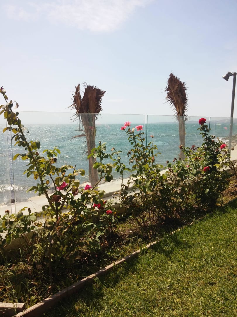 Blick vom Pool zum Meer