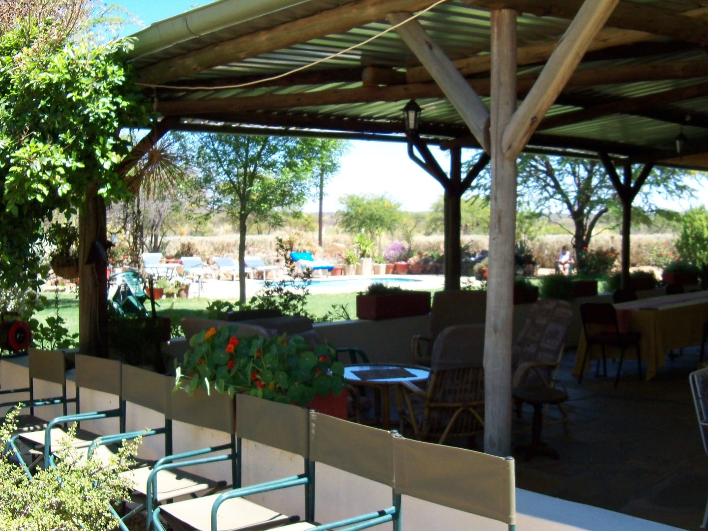 Blick vom Haupthaus zum Pool