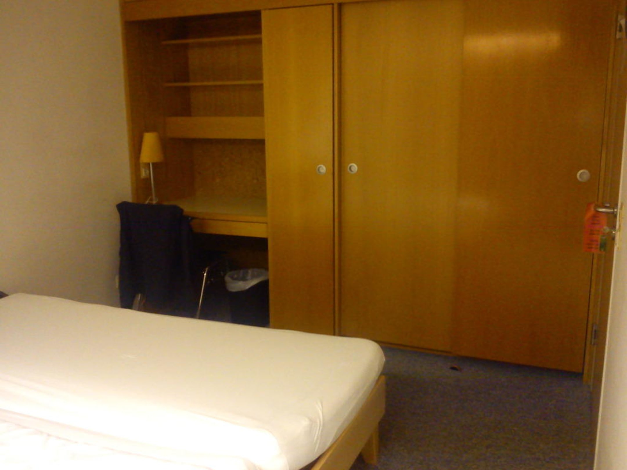 Blick Richtung Schrankwandhinter den Schiebetüren verbergen sich Schubladen und Kleiderstangen für viel Bekleidung