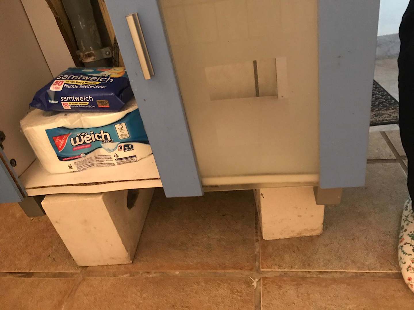 ZimmerDer einzige Badezimmerschrank war sicherheitshalber aufgebockt, da nach dem duschen das ganze Bad unter Wasser stand