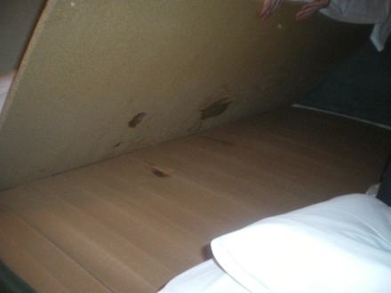 Verschmutztes BettSie ersehen die eingelegt PRessspanplatte im Bett mitsamt den Verschmutzungen