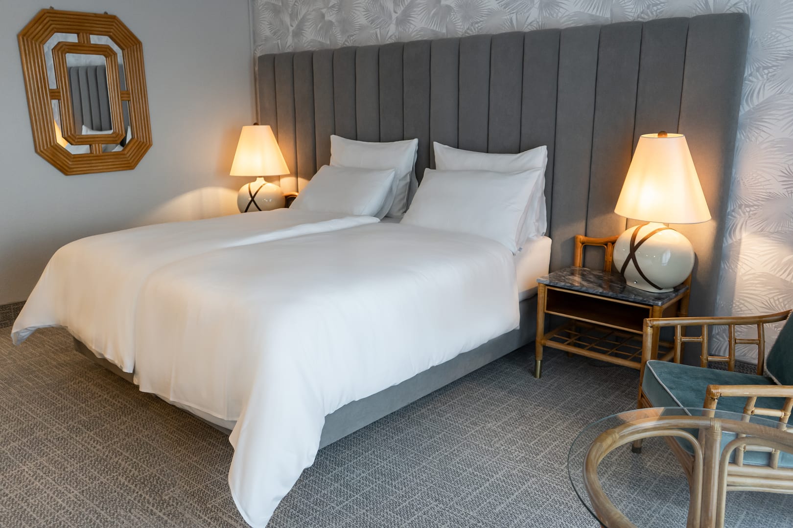 unsere Superior Zimmer, 31 ² groß, Bad, WC getrennt, große, bis zum Boden reichende Fenster, hochwertige Boxspring Betten aus der 5 Sterne Hotellerie, der Rattanstil wurde beibehalten, dies ist die DNA der Pyramide