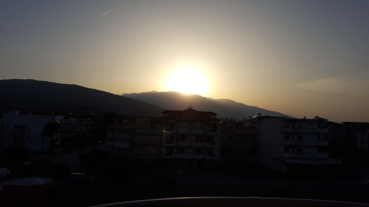 Ein Sonnenuntergang über dem Olymp vom Balkon des Evilion Sea & Sun Hotels