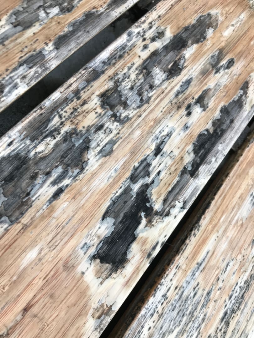ZimmerPoolterrasse der Beach Pool Villa: Abplatzender Lack auf schimmelnden Holzdielen stellt ein Verletzungsrisiko dar.