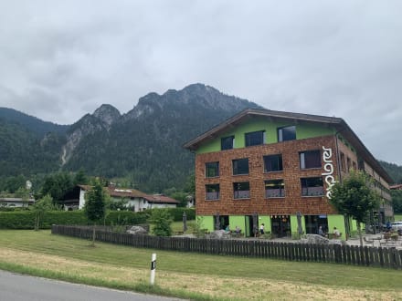 Hotel mit Berg Grünstein im Hintergrund