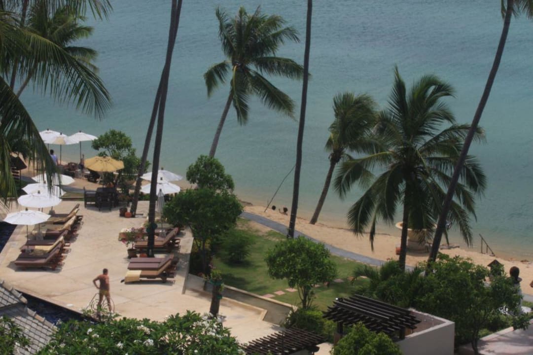 Blick von den Chalets zum Pool und Strand
