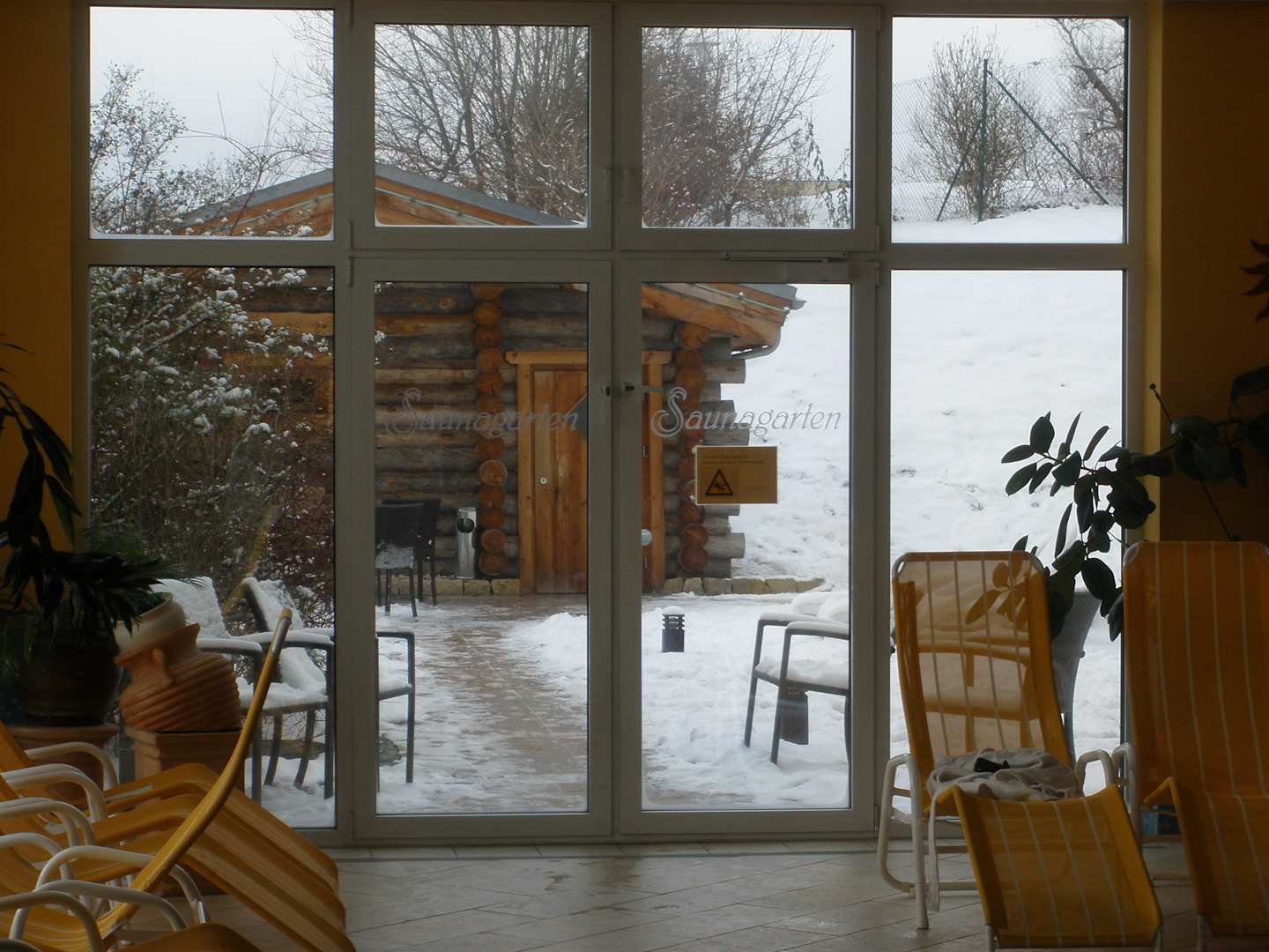 Blick in den Saunagarten mit der Aussensauna