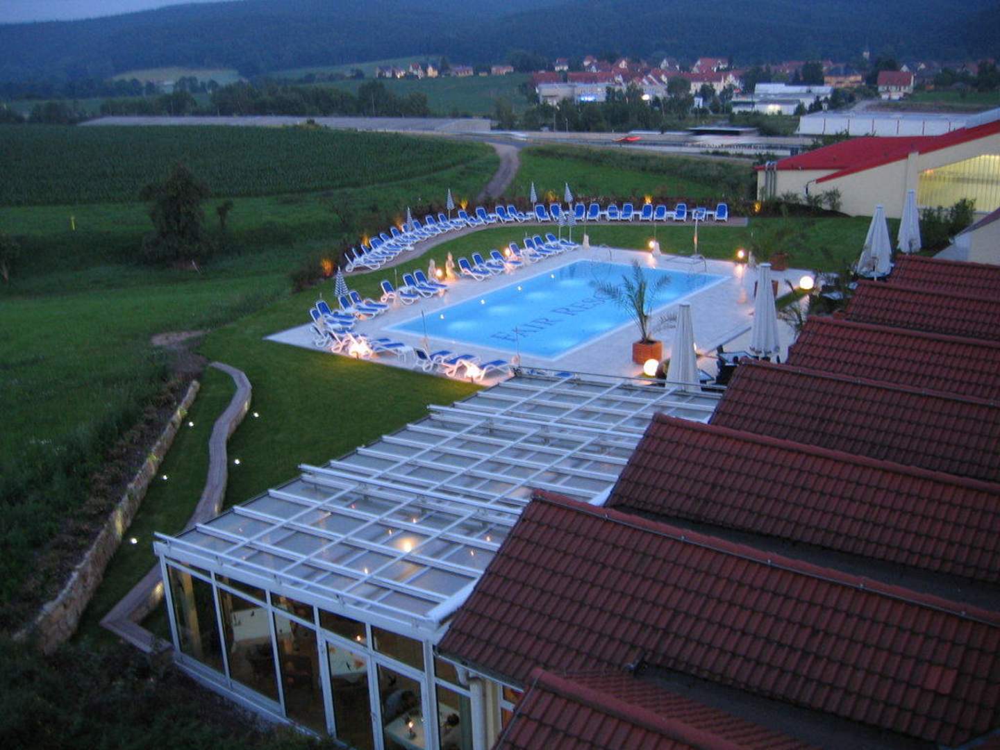 Blich vom 3. Stock auf den Pool und Wintergarten